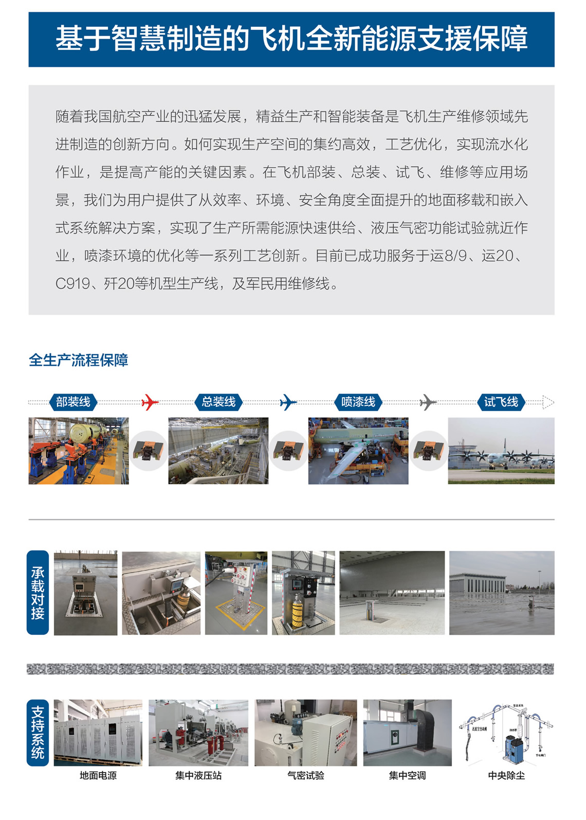 隨著我國航空產(chǎn)業(yè)的迅猛發(fā)展,精益生產(chǎn)和智能裝備是飛機(jī)生產(chǎn)維修領(lǐng)域先進(jìn)制造的創(chuàng)新方向。如何實(shí)現(xiàn)生產(chǎn)空間的集約高效,工藝優(yōu)化,實(shí)現(xiàn)流水化作業(yè),是提高產(chǎn)能的關(guān)鍵因素。在飛機(jī)部裝、總裝、試飛、維修等應(yīng)用場(chǎng)景,我們?yōu)橛脩籼峁┝藦男?、環(huán)境、安全角度全面提升的地面移載和嵌入式系統(tǒng)解決方案,實(shí)現(xiàn)了生產(chǎn)所需能源快速供給、液壓氣密功能試驗(yàn)就近作業(yè),噴漆環(huán)境的優(yōu)化等一系列工藝創(chuàng)新。目前已成功服務(wù)于運(yùn)8/9、運(yùn)20、C919、殲20等機(jī)型生產(chǎn)線,及軍民用維修線。